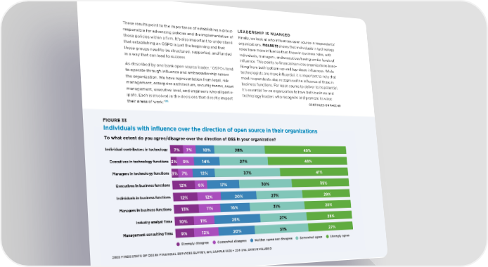 These results point to the importance of establishing a group LEADERSHIP IS NUANCED responsible for advancing policies and the implementation of Finally, we look at who influences open source in respondents’ those policies within a firm. It’s also important to understand FIGURE 33 shows that individuals in technology organizations. that establishing an OSPO is just the beginning and that roles have more influence than those in business roles, with those groups need to be structured, supported, and funded individuals, managers, and executives having similar levels of in a way that can lead to success. influence. This points to financial services organizations bene- fiting from both bottom-up and top-down influences. While As described by one bank open source leader, “OSPOs tend technologists are more influential, it is important to note that to operate through influence and ambassadorship across most respondents also recognized the influence of those in the organization. We have representation from legal, risk business functions. For open source to deliver to its potential, management, enterprise architecture, security teams, asset it’s essential for an organization to have both business and management, executive level, and engineers who all partic- technology leaders who recognize and promote its value. ipate. Each is involved in the decisions that directly impact 26 CONTINUED ON PAGE 40 their areas of work.” FIGURE 33 Individuals with influence over the direction of open source in their organizations To what extent do you agree/disagree over the direction of OSS in your organization? Individual contributors in technology 7% 7% 10% 28% 49% Executives in technology functions 3% 9% 14% 27% 48% Managers in technology functions 3% 7% 12% 37% 41% Executives in business functions 12% 6% 17% 30% 35% Individuals in business functions 12% 12% 20% 27% 29% Managers in business functions 13% 11% 16% 31% 28% Industry analyst firms 10% 11% 25% 27% 28% Management consulting firms 9% 13% 20% 31% 27% Strongly disagree Somewhat disagree Neither agree nor disagree Somewhat agree Strongly agree 2022 FINOS STATE OF OSS IN FINANCIAL SERVICES SURVEY, Q11, SAMPLE SIZE = 224-243, DKNS EXCLUDED THE 2022 STATE OF OPEN SOURCE IN FINANCIAL SERVICES 38