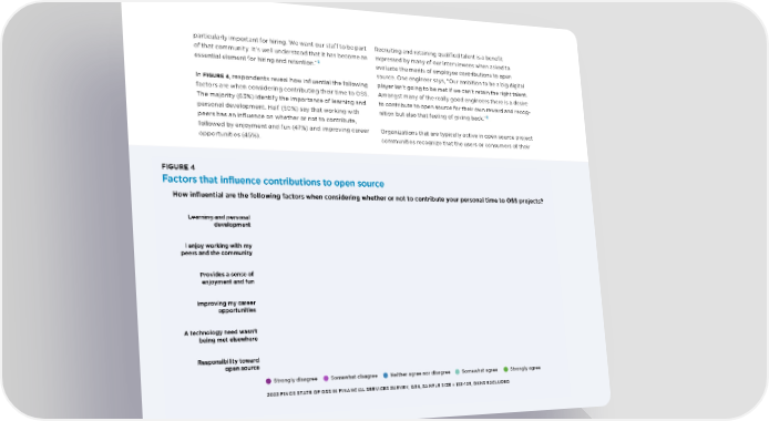 particularly important for hiring. We want our staff to be part Recruiting and retaining qualified talent is a benefit of that community. It’s well understood that it has become an expressed by many of our interviewees when asked to essential element for hiring and retention.”5 evaluate the merits of employee contributions to open source. One engineer says, “Our ambition to be a big digital In FIGURE 4, respondents reveal how influential the following player isn’t going to be met if we can’t retain the right talent. factors are when considering contributing their time to OSS. Amongst many of the really good engineers there is a desire The majority (63%) identify the importance of learning and to contribute to open source for their own reward and recog- personal development. Half (50%) say that working with 6 nition but also that feeling of giving back.” peers has an influence on whether or not to contribute, followed by enjoyment and fun (47%) and improving career Organizations that are typically active in open source project opportunities (45%). communities recognize that the users or consumers of their FIGURE 4 Factors that influence contributions to open source How influential are the following factors when considering whether or not to contribute your personal time to OSS projects? Learning and personal development I enjoy working with my peers and the community Provides a sense of enjoyment and fun Improving my career opportunities A technology need wasn't being met elsewhere Responsibility toward open source Strongly disagree Somewhat disagree Neither agree nor disagree Somewhat agree Strongly agree 2022 FINOS STATE OF OSS IN FINANCIAL SERVICES SURVEY, Q34, SAMPLE SIZE = 133-135, DKNS EXCLUDED THE 2022 STATE OF OPEN SOURCE IN FINANCIAL SERVICES 13