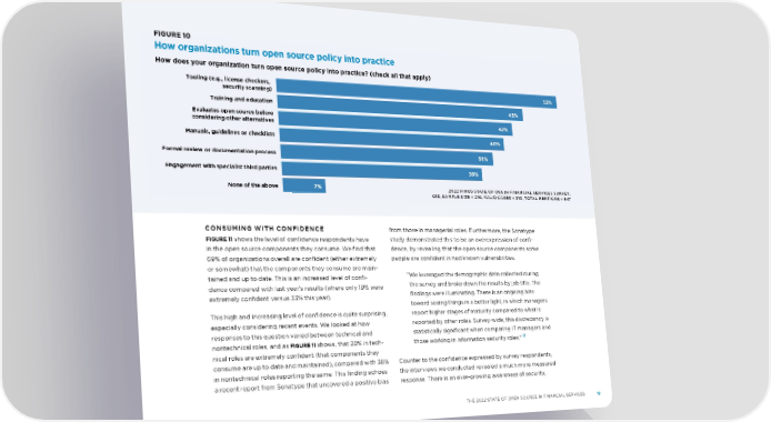 FIGURE 10 How organizations turn open source policy into practice How does your organization turn open source policy into practice? (check all that apply) Tooling (e.g., license checkers, 52% security scanning) Training and education 45% Evaluates open source before considering other alternatives 42% Manuals, guidelines or checklists 40% Formal review or documentation process 38% Engagement with specialist third parties 36% None of the above 7% 2022 FINOS STATE OF OSS IN FINANCIAL SERVICES SURVEY, Q13, SAMPLE SIZE = 210, VALID CASES = 210, TOTAL MENTIONS = 547 CONSUMING WITH CONFIDENCE from those in managerial roles. Furthermore, the Sonatype FIGURE 11 shows the level of confidence respondents have study demonstrated this to be an overexpression of confi- in the open source components they consume. We find that dence, by revealing that the open source components some 69% of organizations overall are confident (either extremely people are confident in had known vulnerabilities. or somewhat) that the components they consume are main- tained and up to date. This is an increased level of confi- “ We leveraged the demographic data collected during dence compared with last year’s results (where only 19% were the survey and broke down the results by job title. The extremely confident versus 33% this year). findings were illuminating. There is an ongoing bias toward seeing things in a better light, in which managers This high and increasing level of confidence is quite surprising, report higher stages of maturity compared to what is especially considering recent events. We looked at how reported by other roles. Survey-wide, this discrepancy is responses to this question varied between technical and statistically significant when comparing IT managers and 13 FIGURE 11 shows, that 28% in tech- those working in information security roles.” nontechnical roles, and as nical roles are extremely confident (that components they consume are up to date and maintained), compared with 38% Counter to the confidence expressed by survey respondents, in nontechnical roles reporting the same. This finding echoes the interviews we conducted revealed a much more measured a recent report from Sonatype that uncovered a positive bias response. There is an ever-growing awareness of security, THE 2022 STATE OF OPEN SOURCE IN FINANCIAL SERVICES 19