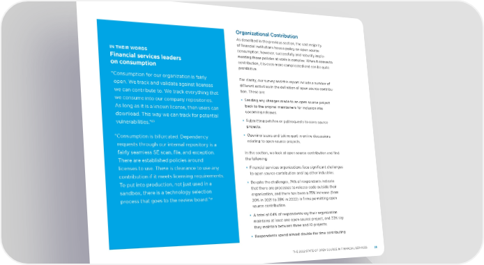Organizational Contribution As described in the previous section, the vast majority of financial institutions have a policy on open source consumption; however, successfully and robustly imple- IN THEIR WORDS menting those policies at scale is complex. When it comes to Financial services leaders contribution, it is even more complicated and can be quite on consumption prohibitive. “ Consumption for our organization is fairly For clarity, our survey and this report include a number of open. We track and validate against licenses different activities in the definition of open source contribu- we can contribute to. We track everything that tion. These are: we consume into our company repositories. • Sending any changes made to an open source project As long as it is a known license, then users can back to the original maintainers for inclusion into upcoming releases. download. This way we can track for potential • Submitting patches or pull requests to open source 20 vulnerabilities.” projects. “ Consumption is bifurcated. Dependency • Opening issues and taking part in online discussions relating to open source projects. requests through our internal repository is a fairly seamless SE scan, file, and exception. In this section, we look at open source contribution and find There are established policies around the following: licenses to use. There is clearance to use any • Financial services organizations face significant challenges contribution if it meets licensing requirements. to open source contribution and lag other industries. To put into production, not just used in a • Despite the challenges, 74% of respondents indicate sandbox, there is a technology selection that there are processes to release code outside their organization, and there has been a 75% increase (from process that goes to the review board.”21 20% in 2021 to 35% in 2022) in firms permitting open source contribution. • A total of 64% of respondents say their organization maintains at least one open source project, and 33% say they maintain between three and 10 projects. • Respondents spend almost double the time contributing THE 2022 STATE OF OPEN SOURCE IN FINANCIAL SERVICES 25