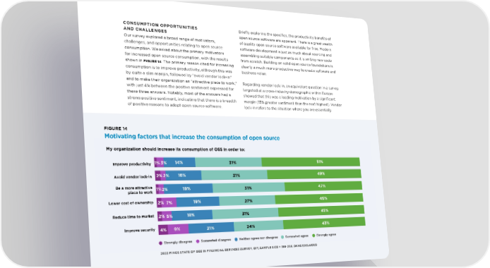 CONSUMPTION OPPORTUNITIES Briefly exploring the specifics, the productivity benefits of AND CHALLENGES open source software are apparent. There is a great wealth Our survey explored a broad range of motivators, of quality open source software available for free. Modern challenges, and opportunities relating to open source software development is just as much about sourcing and consumption. We asked about the primary motivators assembling suitable components as it is writing new code for increased open source consumption, with the results from scratch. Building on solid open source foundations is FIGURE 14. The primary reason cited for increasing shown in clearly a much more productive way to create software and consumption is to improve productivity, although this was business value. by quite a slim margin, followed by “avoid vendor lock-in” and to make their organization an “attractive place to work,” Regarding vendor lock-in, an equivalent question in a survey with just 4% between the positive sentiment expressed for targeted at a cross-industry demographic within Europe these three answers. Notably, most of the answers had a showed that this was a leading motivation by a significant strong positive sentiment, indicating that there is a breadth margin (13% greater sentiment than the next highest). Vendor of positive reasons to adopt open source software. lock-in refers to the situation where you are essentially FIGURE 14 Motivating factors that increase the consumption of open source My organization should increase its consumption of OSS in order to: Improve productivity 1%3% 14% 31% 51% Avoid vendor lock-in 2%2% 16% 31% 49% Be a more attractive 1%2% 19% 31% 47% place to work Lower cost of ownership 2% 7% 19% 27% 46% Reduce time to market 2% 5% 18% 31% 45% Improve security 4% 9% 21% 24% 43% Strongly disagree Somewhat disagree Neither agree nor disagree Somewhat agree Strongly agree 2022 FINOS STATE OF OSS IN FINANCIAL SERVICES SURVEY, Q17, SAMPLE SIZE = 199-203, DKNS EXCLUDED THE 2022 STATE OF OPEN SOURCE IN FINANCIAL SERVICES 23